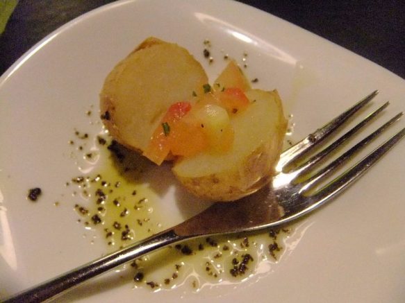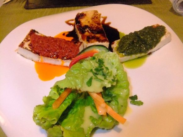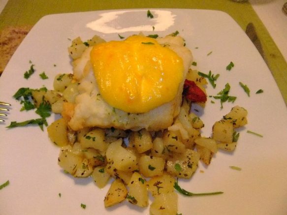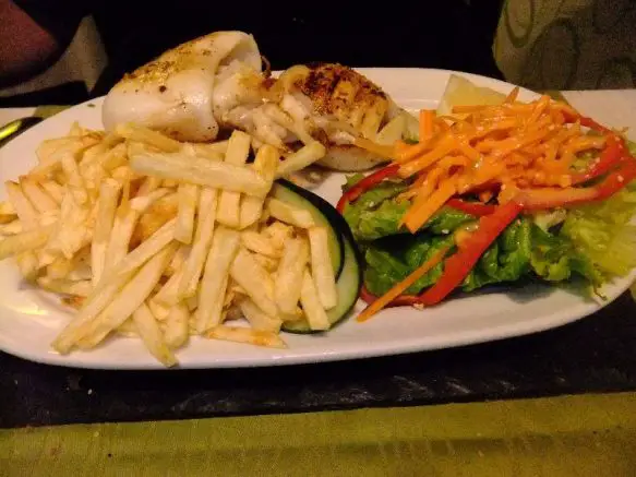 Essen nach La Palma Art mit gefüllten Papas arrugadas (Runzelkartoffeln), gebratenem Ziegenkäse (Queso asado) mit den klassischen Mojo-Sossen (rot-Mojo picante/suave >grün-Mojo verde und einer Honig-Mojo nach Art des Hauses). Fisch in jeder Fasson – hier frischer Alfonsiño auf Bratkartoffeln mit einem Eigelbmantel. Auch der Choco (Tintenfischart) mit der internationalen Pommes-Ausführung ist ein Schmankerl.